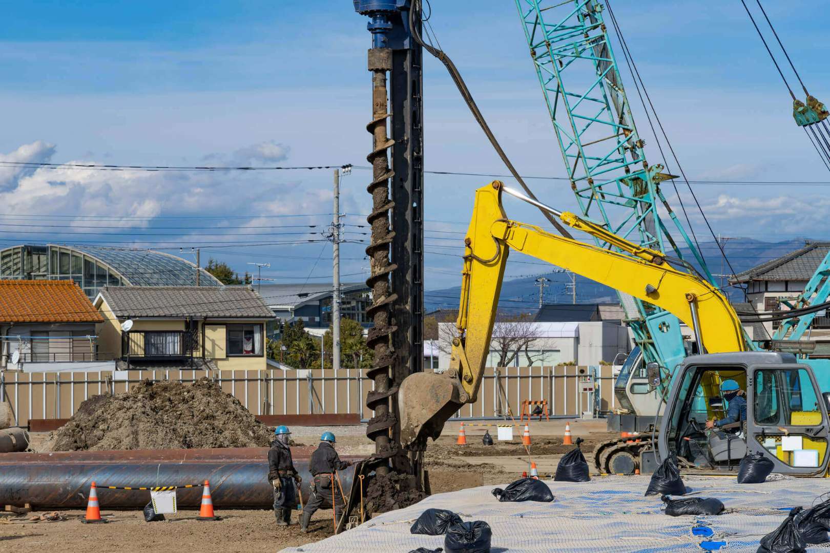 基礎工事とはその名のとおり建物の基礎部分を作る工事のことで、基礎工事がしっかりされていなければ、建物自体が不安定になってしまいます。たとえば、地盤が弱い場合は、そのまま建物を建てると地盤沈下を起こしてしまう危険もあるため、補強工事をしなければなりません。その際、地面に杭を打ち込んで基礎を支える工事のことを杭基礎と呼びます。そのほかには、地盤にとくに問題がない場合は、全面にコンクリートを張って建物を支えるような構造にもできます。